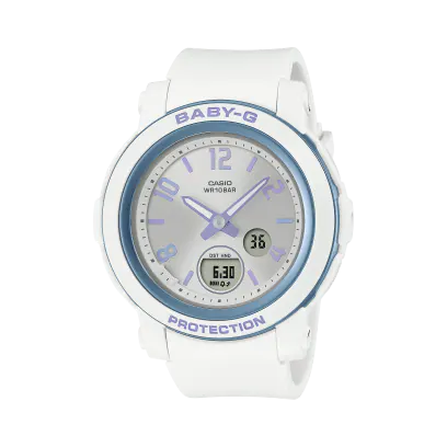 Indulge your fancy with one of these mysterious and magical BABY-G watches with a virtual flair. Light and color play across the iconic wide face and slim design of the BGA-290 for an easy-to-read watch with a unique twist. Index marks with a holographic finish pair with hands and bezel ring in glossy color to complete the look. These watches deliver practical functionality, as well, with shock-resistant construction and water resistance up to 100 meters. Each tilt of the wrist alters the interplay of light and color. Let yourself be captivated by a timepiece that invites you into a world of fantasy.