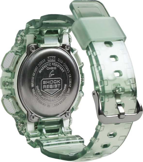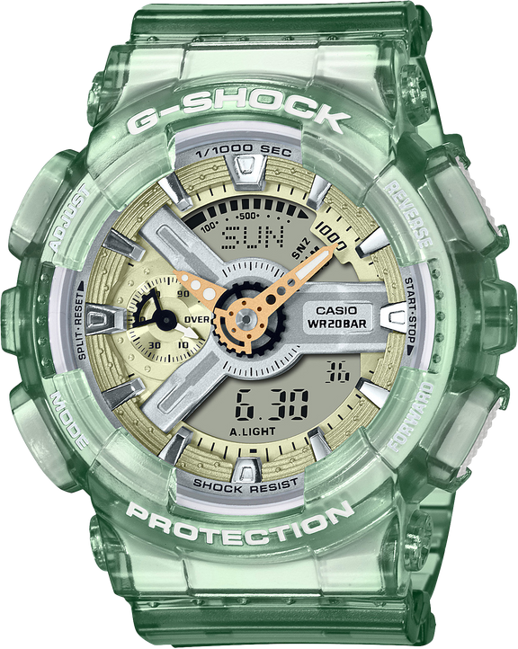 Inspired by a surge of sound flowing over a dance floor, these watches translate this vision into color and design for a stereophonic take on the rugged GMAS110 with its sturdy oversized case featuring analog hands and digital display.