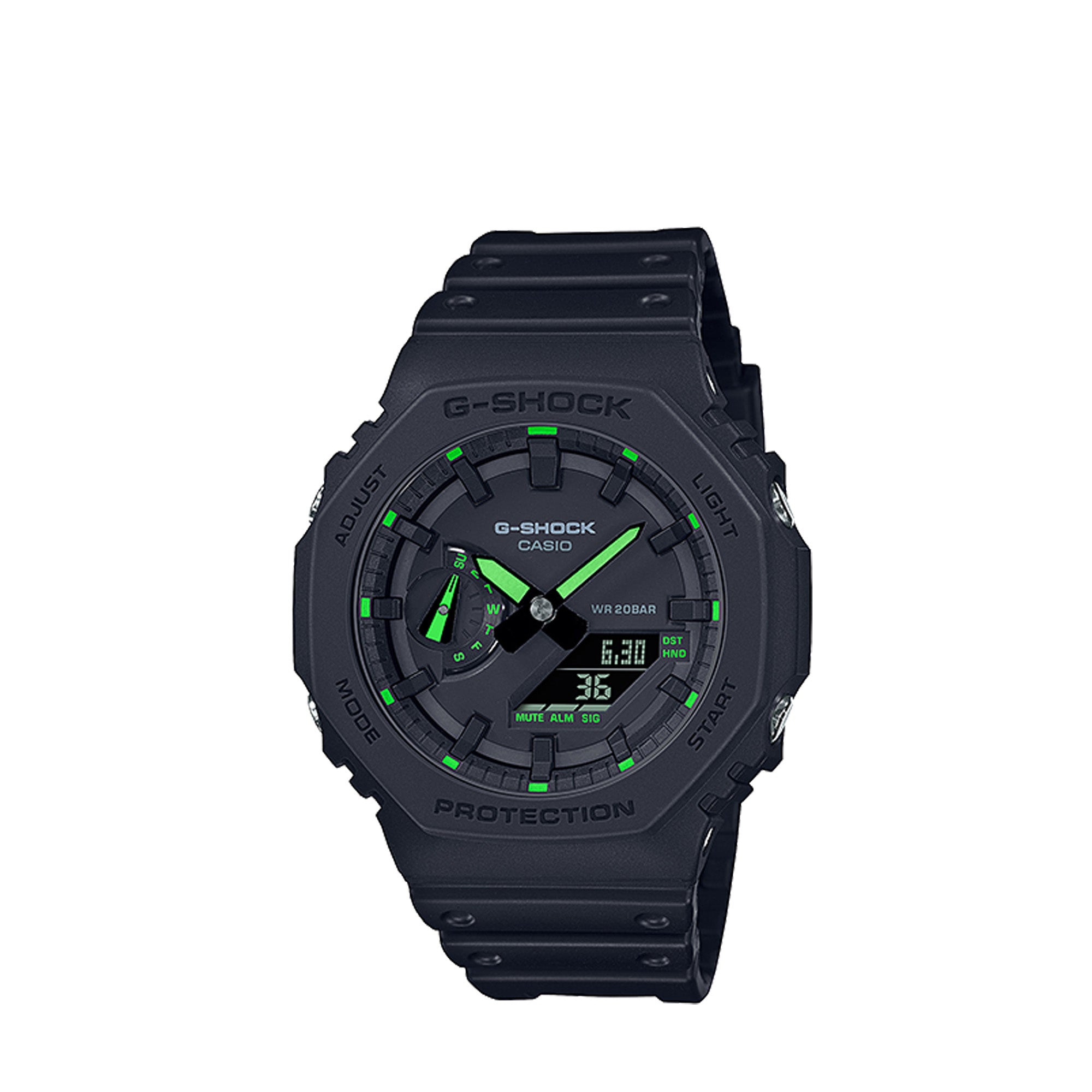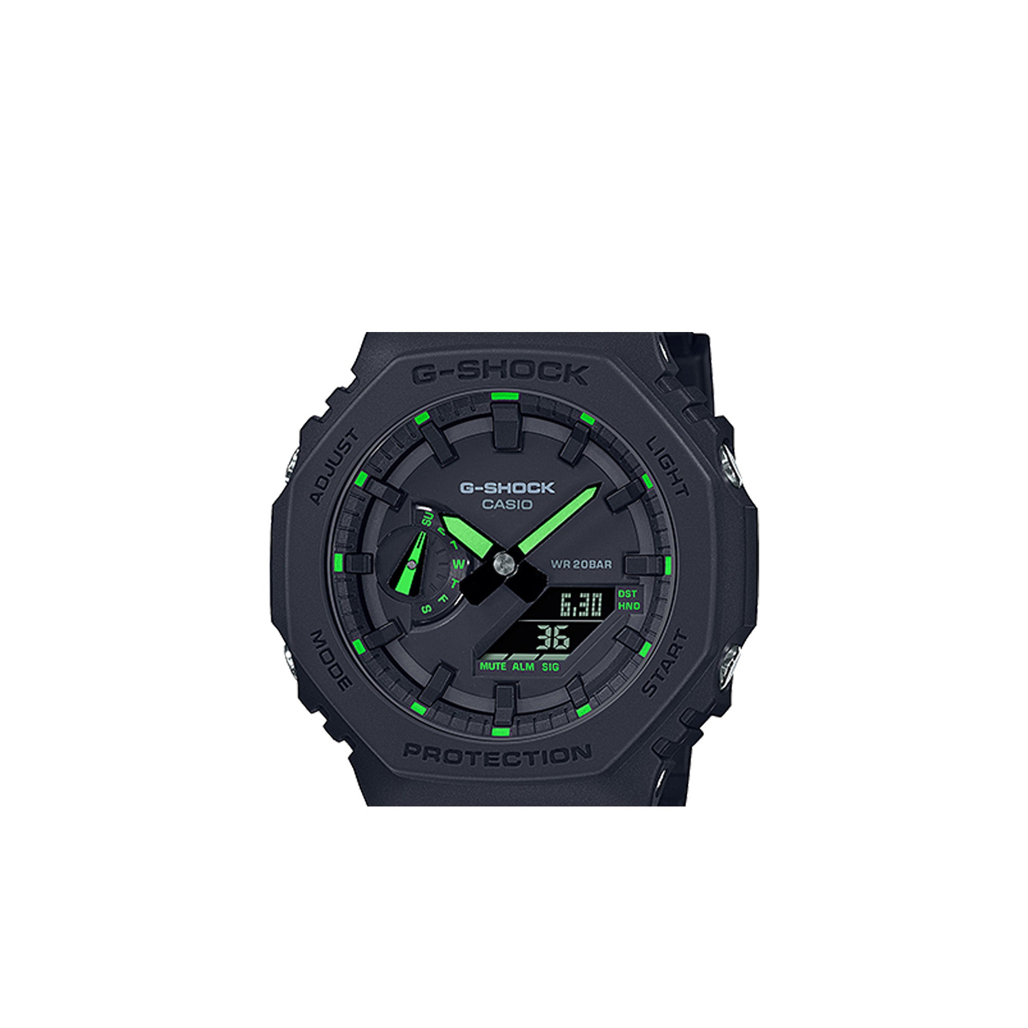 The octagonal shape and streamlined design of the GA-2100 puts on textured matte black and vibrant neon color for a stylishly cool new look. Hour and minute hands with phosphorescent paint stay visible in the dark to keep you on your game all day and night.