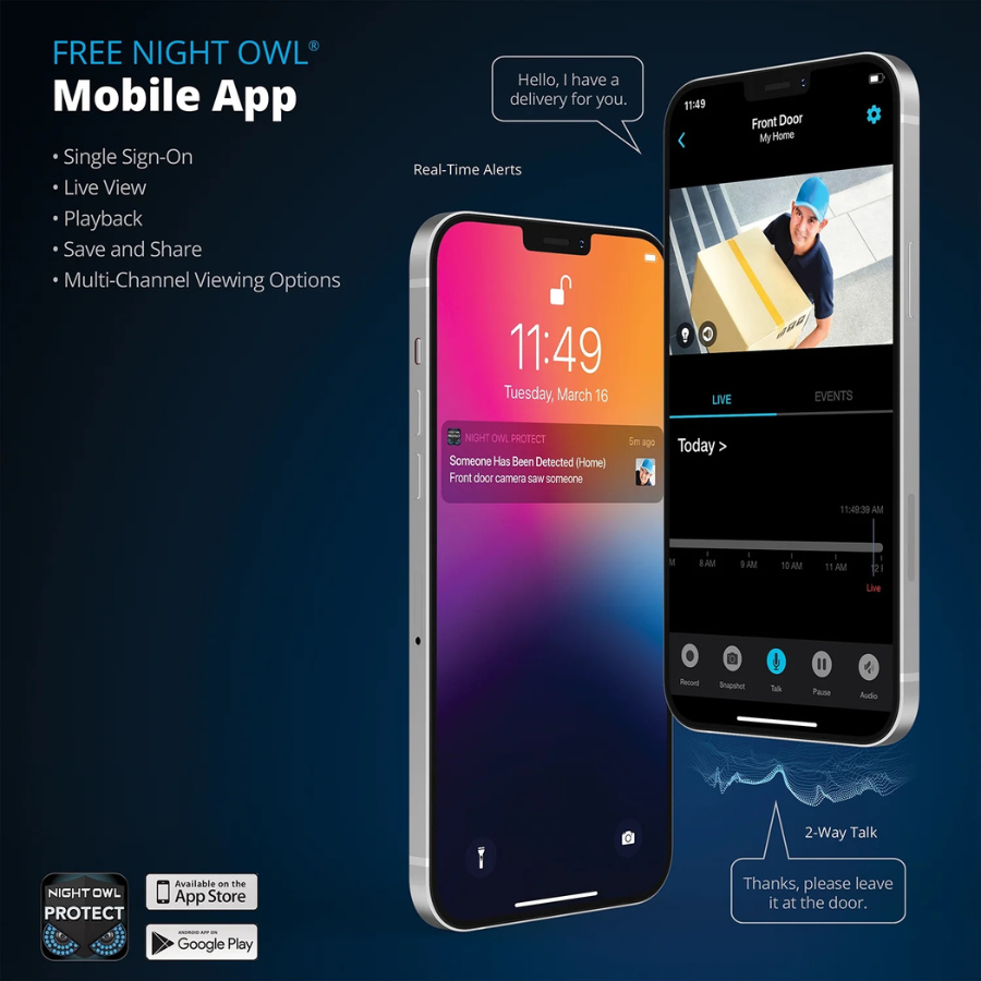 Equipped with built-in motion-activated spotlights, these cameras help deter intruders by automatically illuminating the area when motion is detected. Combined with infrared night vision, they offer reliable surveillance around the clock—even in complete darkness. The integrated two-way audio lets you hear and speak to visitors directly through the cameras via the Night Owl Protect mobile app, adding an interactive layer to your security setup.