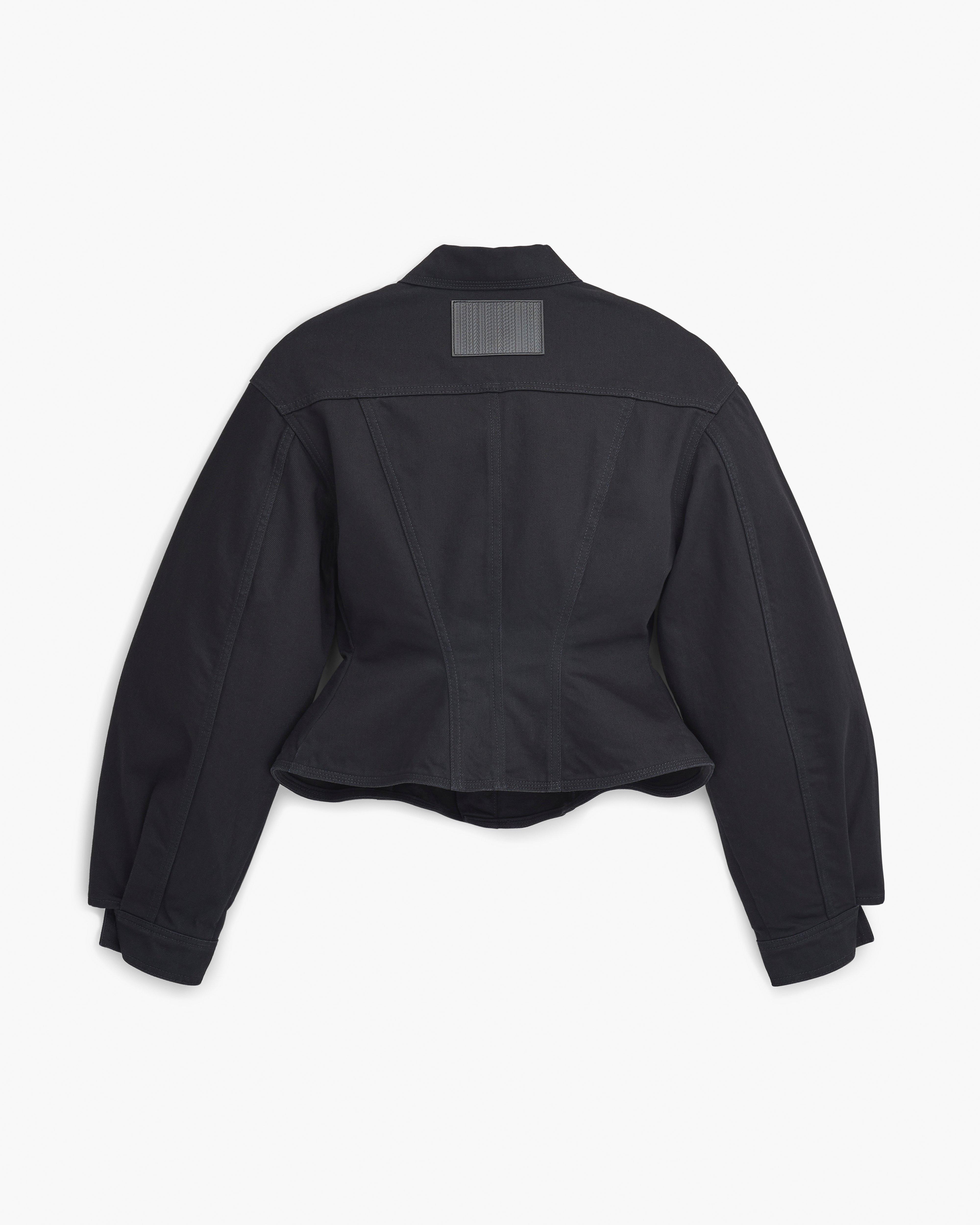 - Inspired by corsets, this denim jacket is designed with a cinched waist and flared hem. This piece is finished with our signature leather barcode patch at the center back neck. Style with the matching Fluted Mini Skirt to complete the look.